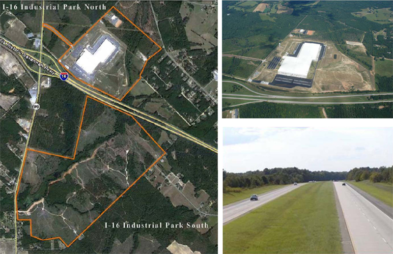 左: I-16 Industrial Parks - North and South、右上: 既存工場、右下: 片側2車線のInterstate-16